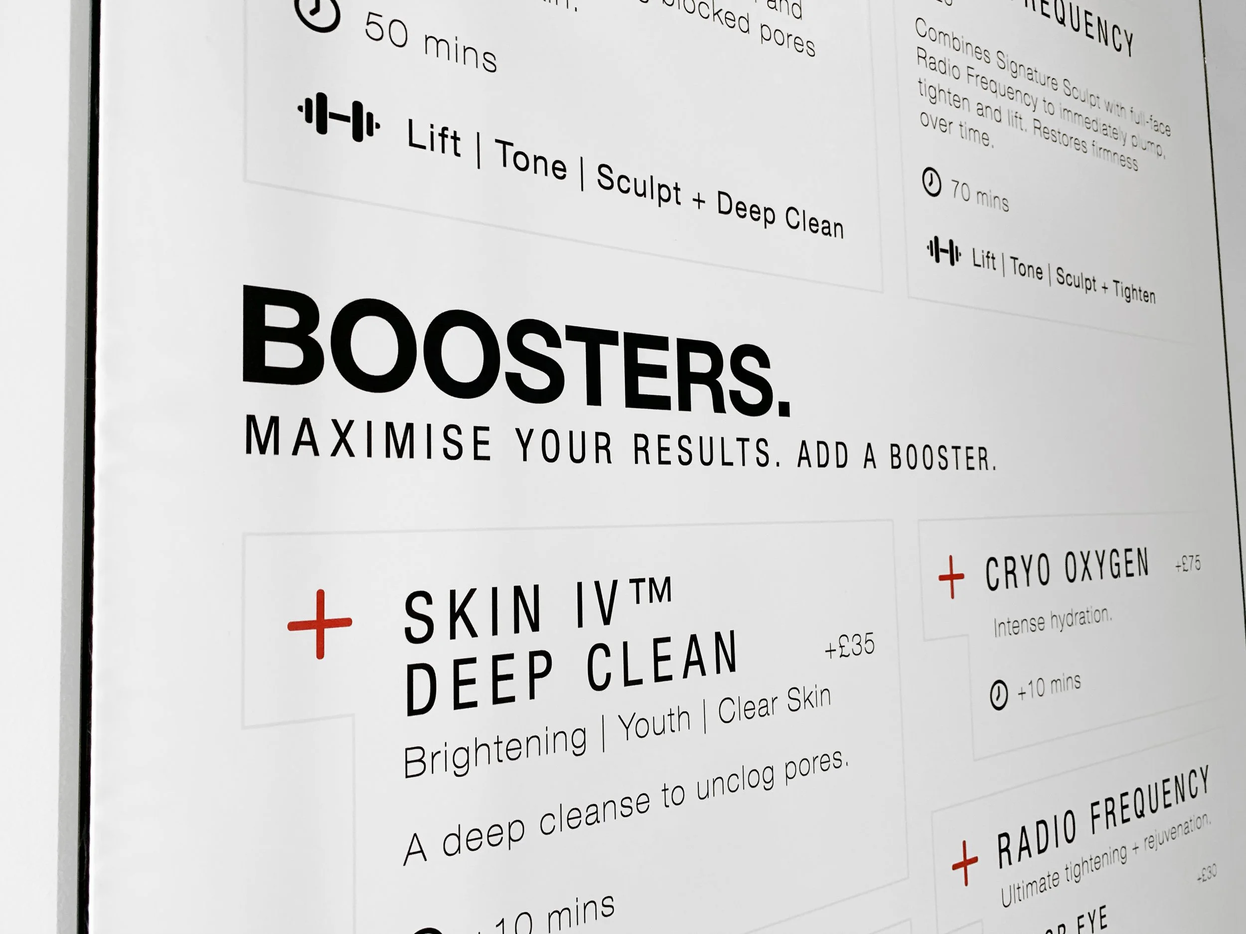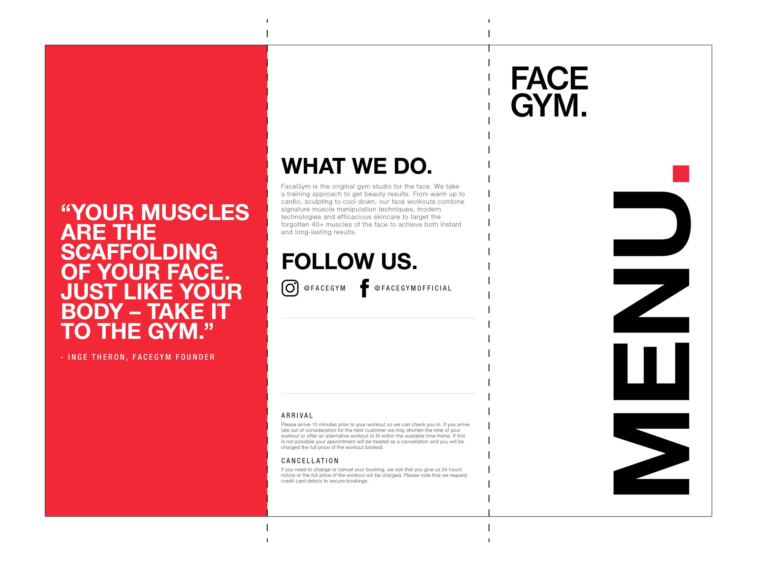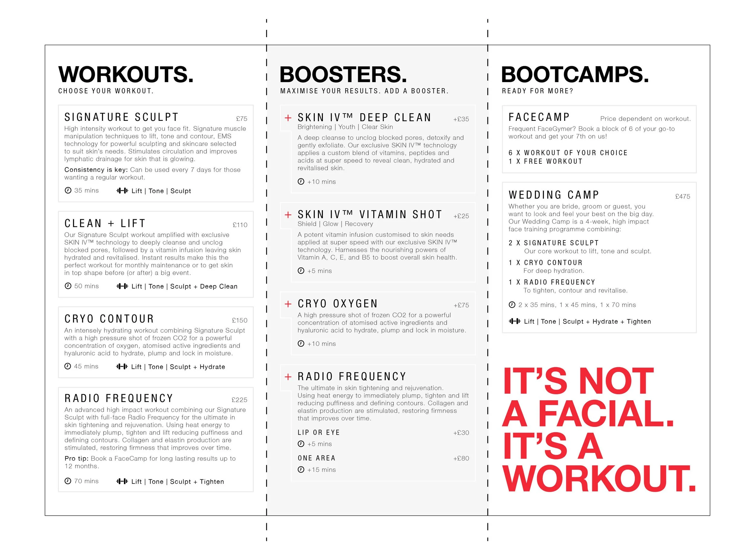 In line with the launch of two new facials to the brand’s service offering, I redesigned the menu, creating a new design system across online/offline. This involved adapting the new design across multiple lightbox and large-format specs across FaceGym’s 11 studios. I also art directed stills and video for the launch campaign, website and POS.